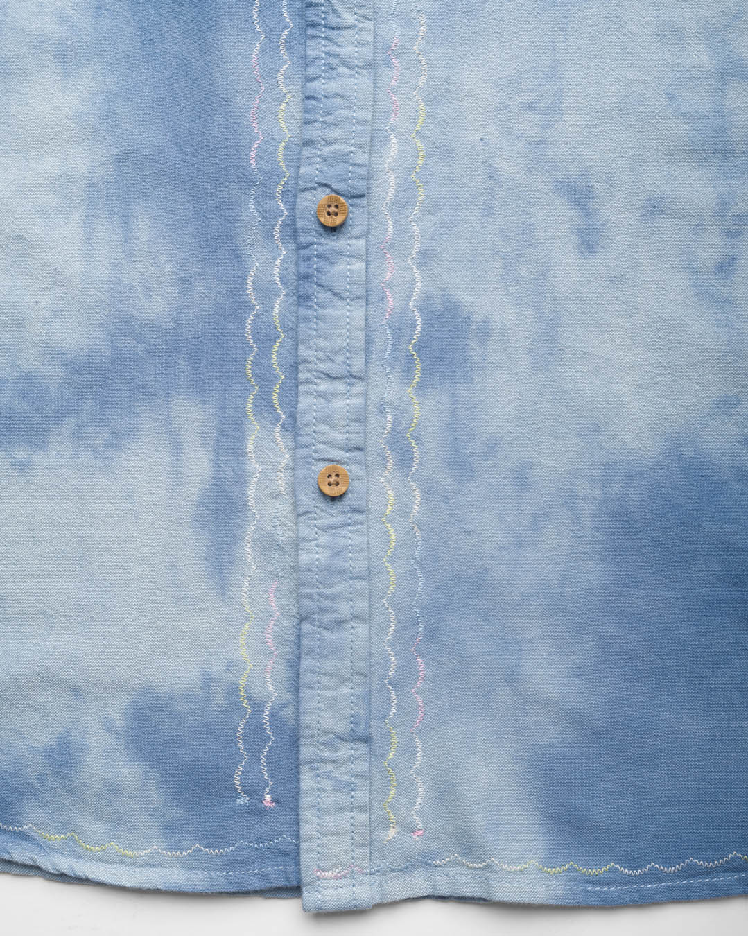 ︎beautiful sunny warm vibe vintage button up w scalloped embroidered detailing, a vintagehand embroidery, and a deadstock patches - spiralling embroidery, golden cow, and
